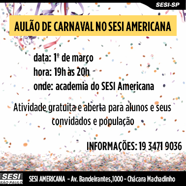 Na sexta, dia 1º de março, o SESI Americana promove o Aulão de Carnaval, com marchinhas de carnaval, axé, dança e muita folia para dar start no carnaval. A atividade é gratuita para alunos da academia e seus convidados.